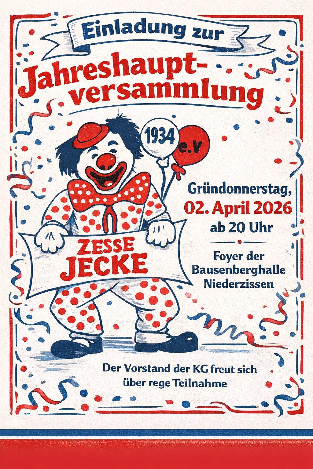 Die Karnevalsgesellschaft Zesse Jecke lädt alle Mitglieder herzlich zur diesjährigen Jahreshauptversammlung ein. Diese findet an Gründonnerstag, den 02.04.2026, um 20:00